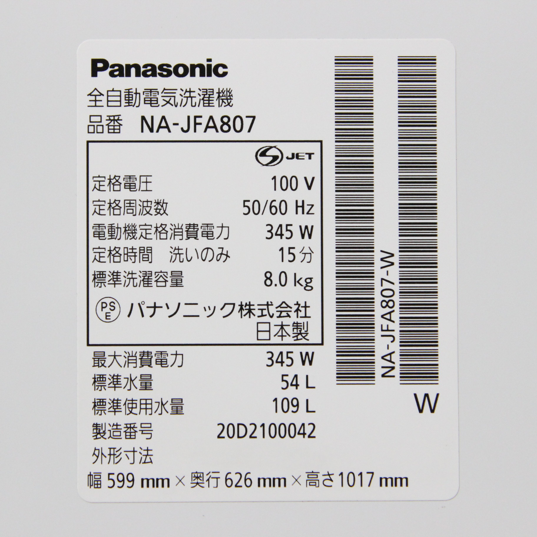 - 商品名:〔展示品〕 全自動洗濯機 NA-JFA807-W Jconcept(Jコンセプト) クリスタルホワイト [洗濯8.0kg /乾燥機能無 /上開き]