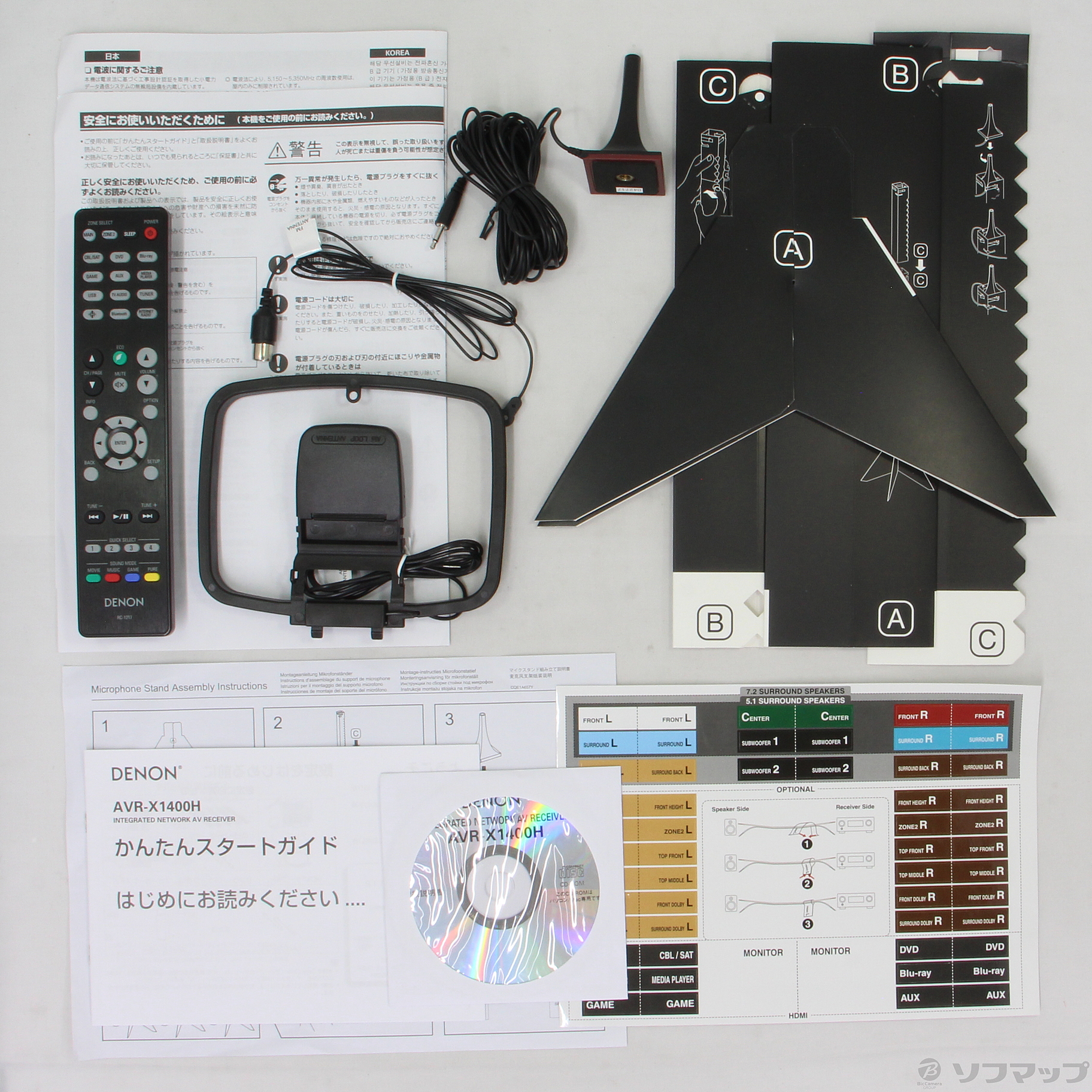- かんたんスタートガイド、安全にお使いいただくために、電波に関するご注意、マイクスタンド組立て説明書、CD-ROM(取扱説明書)、リモコン、セットアップマイク、マイクスタンド、FM室内アンテナ、AMループアンテナ、ケーブルラベル