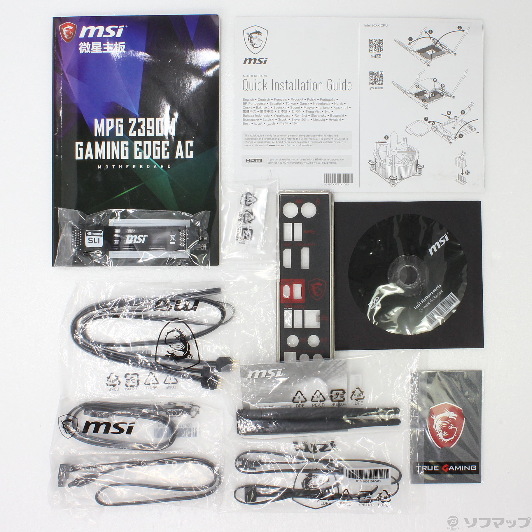 - ユーザーズマニュアル、クイック取り付けガイド、アンテナ(2本)、SLI Bridge、M.2ネジ(2個)、ケースのバッジ、I/Oシールド、ドライバーDVD、SATA 6Gb/sケーブル(1/2)、SATA 6Gb/sケーブル(2/2)、LED Yケーブル、LED JRAINBOWケーブル