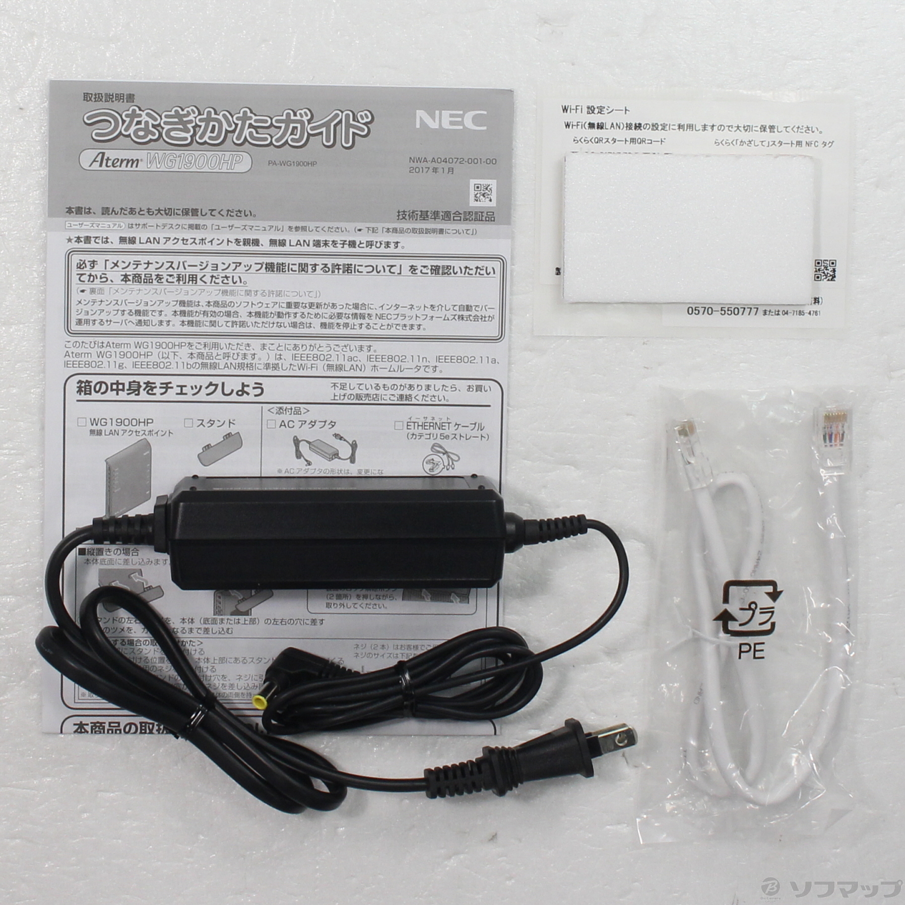 - つなぎかたガイド、Wi-Fi設定シート、ACアダプター、スタンド、ETHERNETケーブル