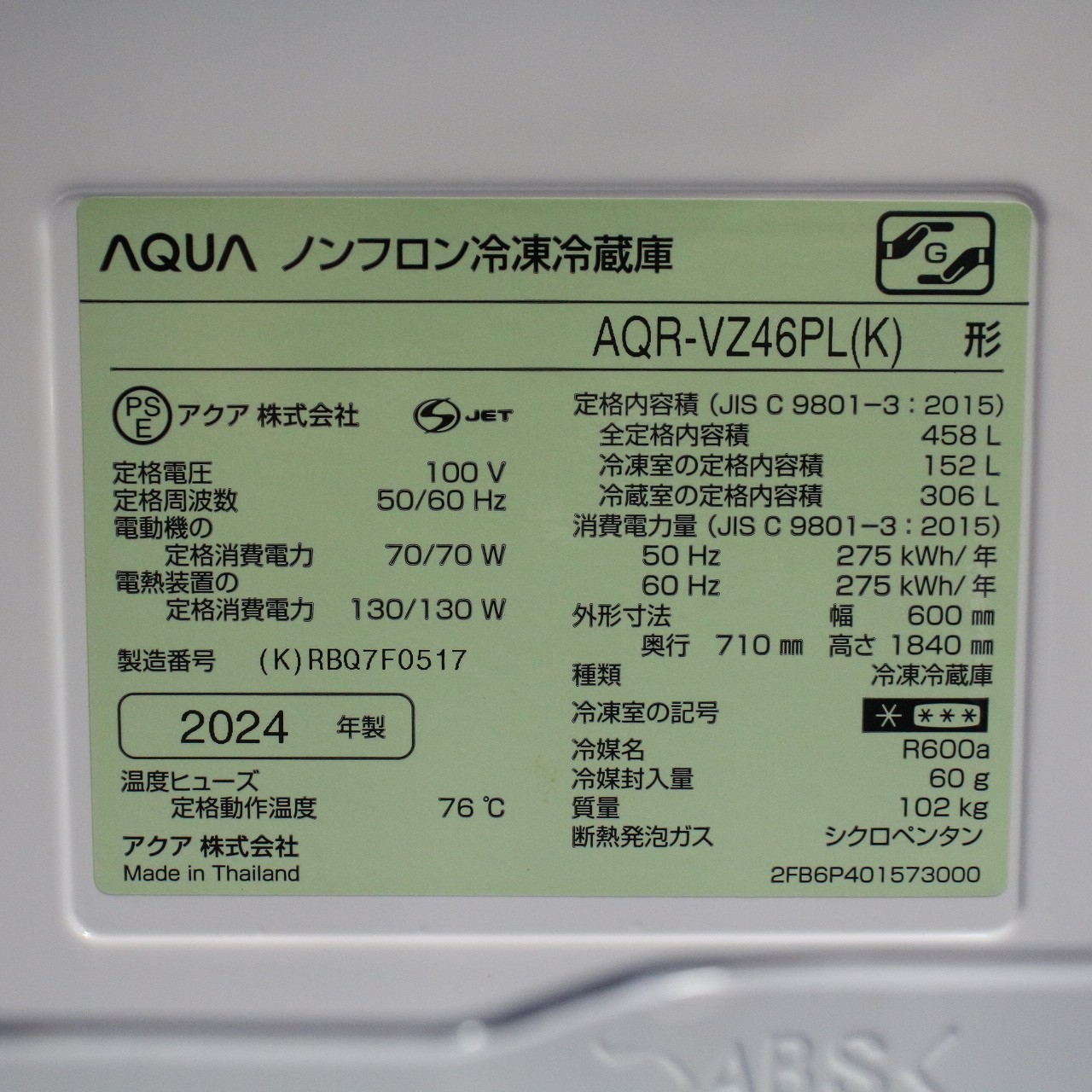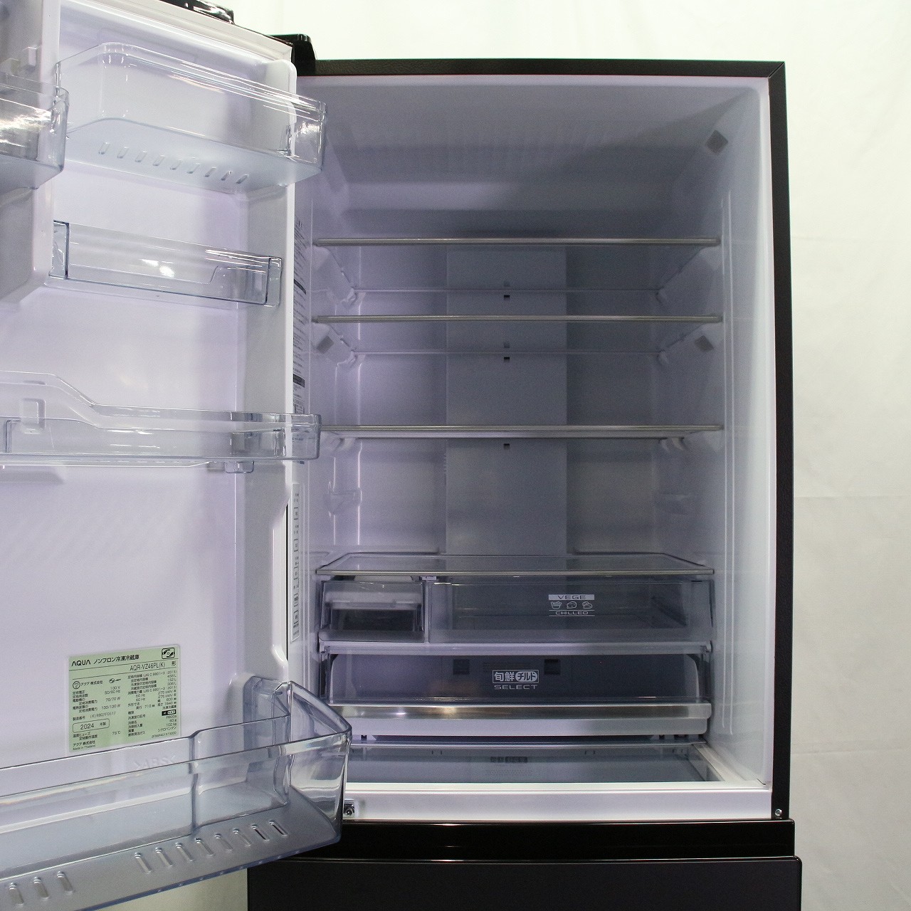 - 商品名:〔中古品〕 冷蔵庫 Delie マットクリアブラック AQR-VZ46PL(K) [幅60cm /458L /4ドア /左開きタイプ /2024年]