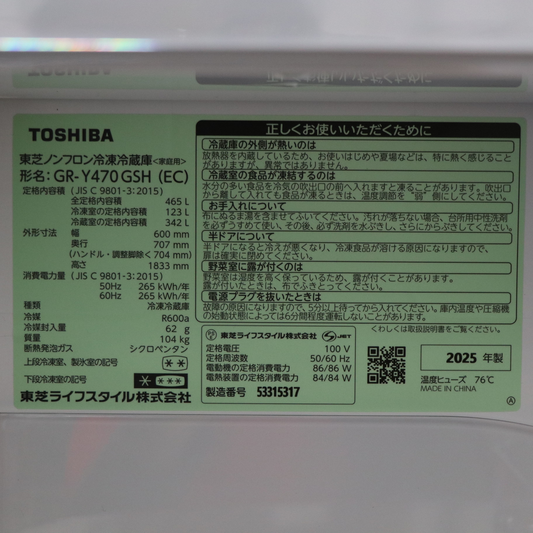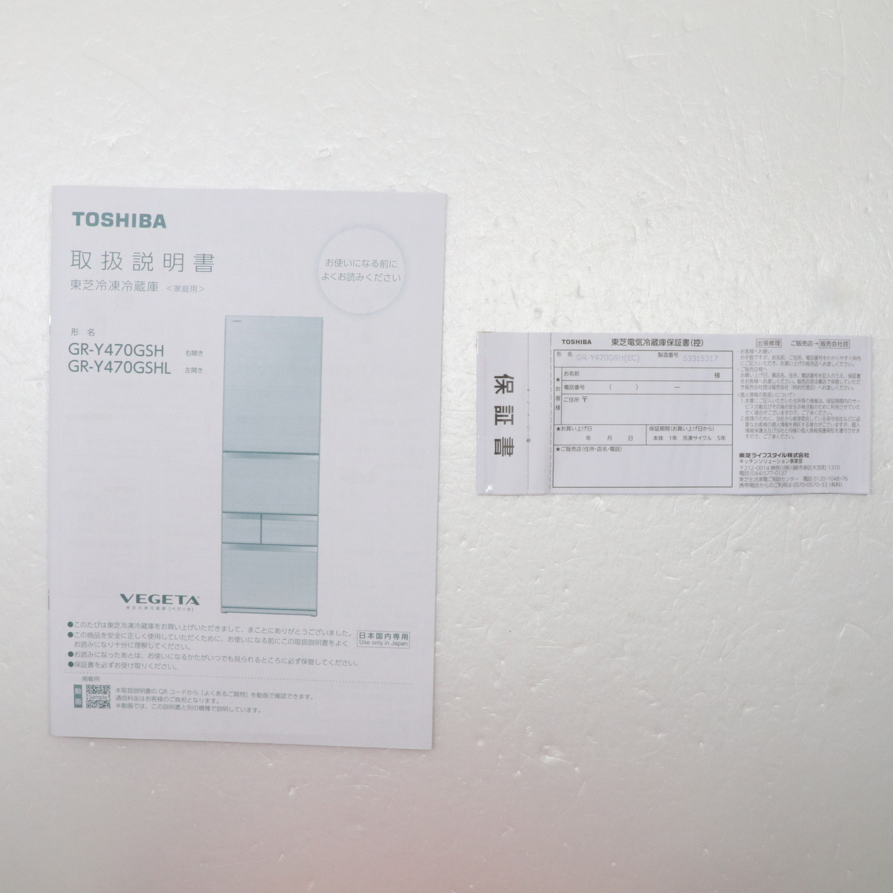 - 取扱説明書、調整脚×2、前面グリル、卵スタンド、アルミトレイ(チルド)、野菜冷凍マット、給水タンク一式、アイスシャベル、おそうじ口のフタ