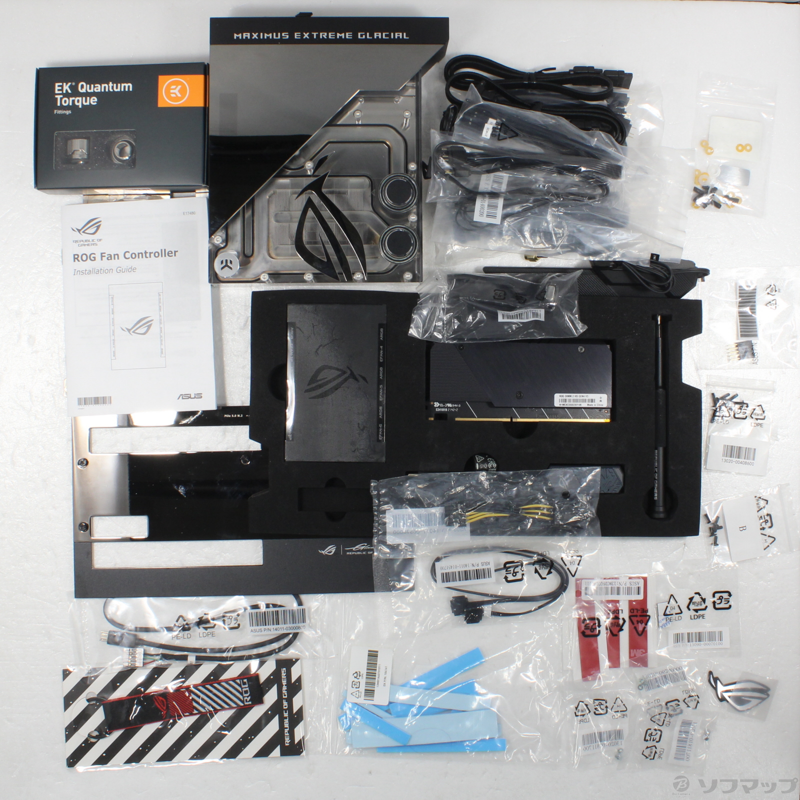 - Fan Controller マニュアル、ユーザーマニュアル、3-in-1 サーミッターケーブルパック、ROG Fan Controller、ROG DIMM.2用ヒートシンク、ROG DIMM.2用M.2 ゴムパッド、モノブロック、モノブロック用サーマルパッド、モノブロック用フィッティングボックス、M.2ヒートシンク、ASUS Wi-Fiアンテナ、Qコネクタ、ROG CLAVIS DAC、ROGグラフィックカードホルダー、3分配 ARGBスプリッターケーブル、2分配 ARGBスプリッターケーブル、4分配 ファンスプリッターケーブル x2、RGB延長ケーブル、ROG weave SATA 6Gb/s ケーブル x3