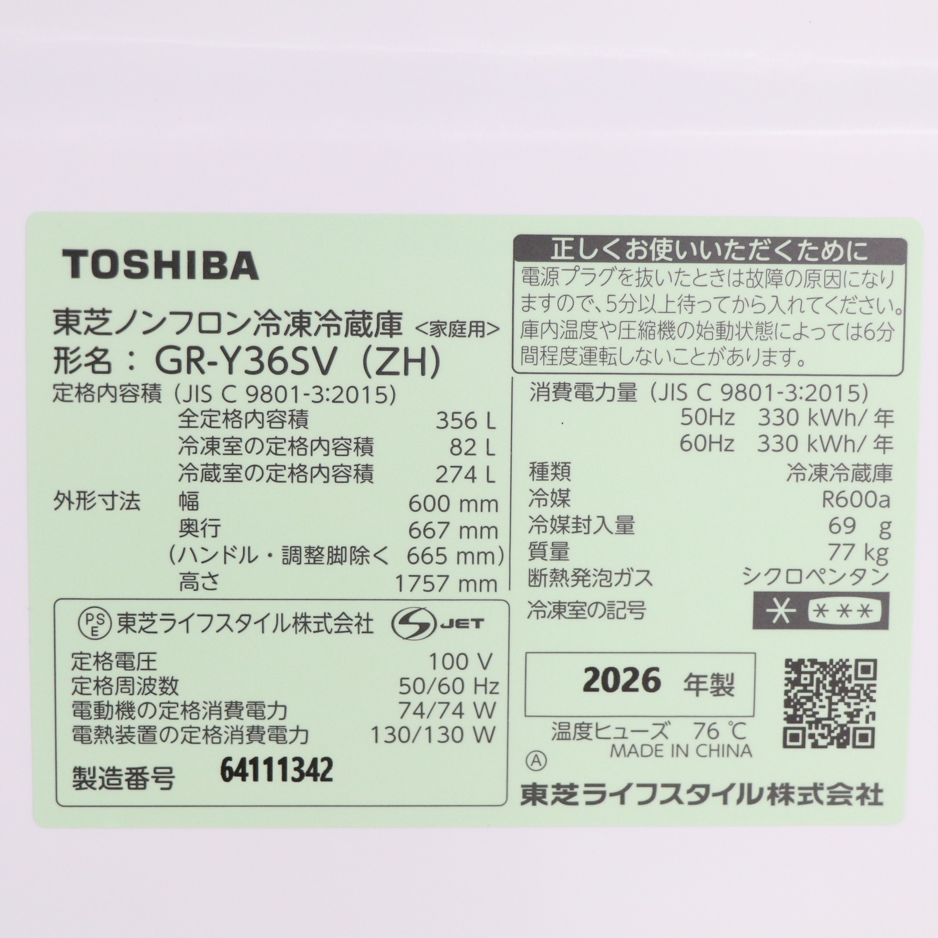 - 商品名:〔展示品〕 冷蔵庫 VEGETA(ベジータ)SVシリーズ アッシュグレージュ GR-Y36SV-ZH [幅60cm /356L /3ドア /右開きタイプ /2025年]