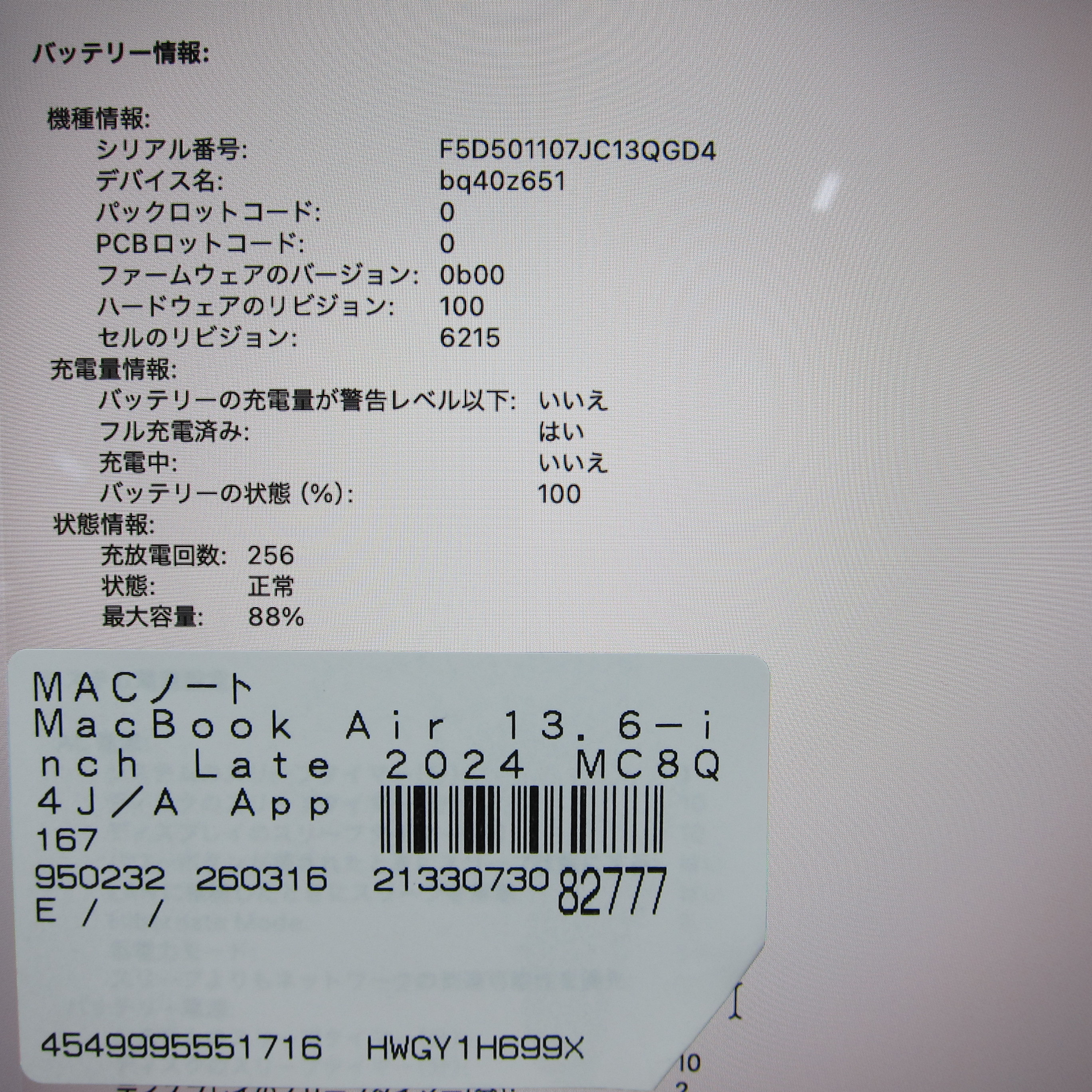 - 商品名:MacBook Air 13.6-inch Late-2024 MC8Q4J/A Apple M3 8コアCPU_10コアGPU 24GB SSD512GB ミッドナイト 〔macOS v26.3.2〕